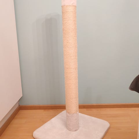 Vuosia hyvässä käytössä ollut kissanpuu. Korkeus n. 160cm. Narut vaihdettu useammankin kerran vuosien aikana, mutta itse runko vielä ehjä. Käytön jälkiä toki näkyy. :)