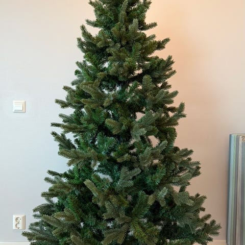 Vain kerran koottu laadukas Triumph Tree Bristlecone. Myytiin 155cm mutta todellisuudessa latvan kanssa lähempänä 165cm. Metallinen jalka jossa jo ostaessa oli pieni naarmu. Mallissa ei ole integroituja valoja eivätkä koristeet tule mukana.