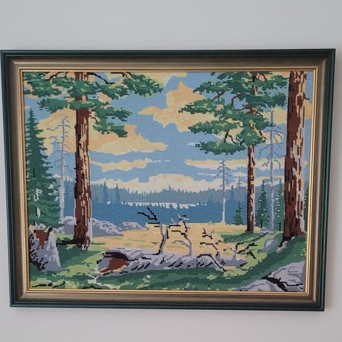 Se on kehystetty puunvärisillä kehyksillä, joissa on sisäpuolella vihreä korostuslista.