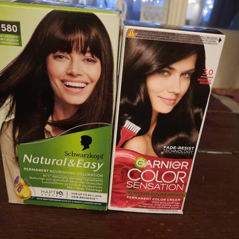Kolme käyttämätöntä hiusväripakkausta. Kaksi ruskeaa, yksi musta.