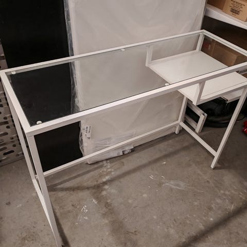 Ikea lasinen työpöytä, lasin saa nostettua pois. Vähän hutera mutta hyvin pystyssä pysyy!