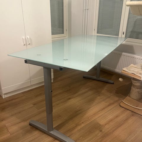 Ehjä lasinen työpöytä. Korkeutta voi säätää. Mitat 160cm x 80cm. Pinnassa näkyy hyvää valoa vasten käytönjälkijä, mutta yleisilmeeltään ihan hyvässä kunnossa. Löytyy myös johtokouru mihin saa johdot hyvin piiloon/nippuun.