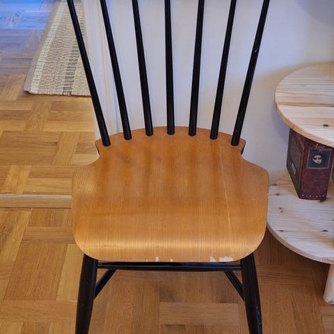 Kaksi vanhaa pinnatuolia. Kaikki liitokset liimattu. Valkoiset osat maalattu puolihimmeällä valkoisella maalilla. Istuin osa myös käsitelty.