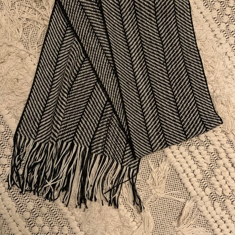Kuvanmukainen tosi pitkä ja paksu kaulahuivi hapsuilla. Vaaleanpuna-valkoinen. Ollut pääosin vain kaapissa, joten päätin tästä luopua.