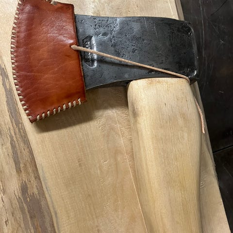 Retkikirves, jossa on puinen kahva. Kirves on 40cm pitkä ja edelleen tehtaan pahveissa.