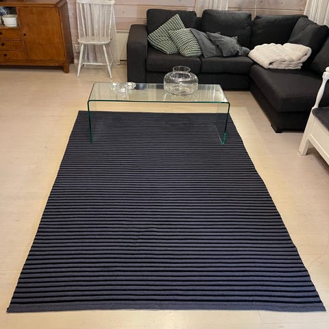 IKEA villamatto, jossa on raidallinen kuvio tumman ja vaalean harmaan sävyissä.