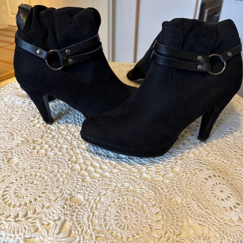 Tyylikkäät naiselliset saappaat korkeilla varsilla, jotka voi pitää myös taiteltuina. Varsissa on puolipitkät vetoketjut. Käytön jälkiä on uökopinnassa ja siksi hinta on vitosen, vaikka saappaat ovatkin muuten ehjät.