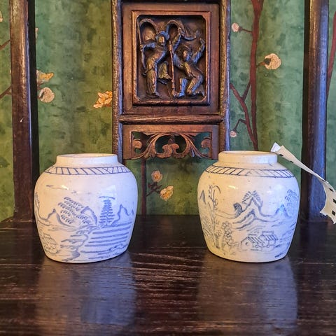 Uskomattoman kauniit, erittäin koristeelliset ja hurmaavat kiinalaiset inkivääripurkit – pari. Pari on rikkaasti koristeltu viehättävällä maalaismaisemalla, ja kansien päälle on maalattu kauniita rypäleitä. Mielestämme kokonaisuus on hyvässä alkuperäisessä kunnossa ja alkuperäinen patina on erinomainen.Mitat: korkeus 15 cm, halkaisija 13 cmTuotteet lähetetään rekisteröidyllä lähetyksellä.