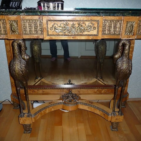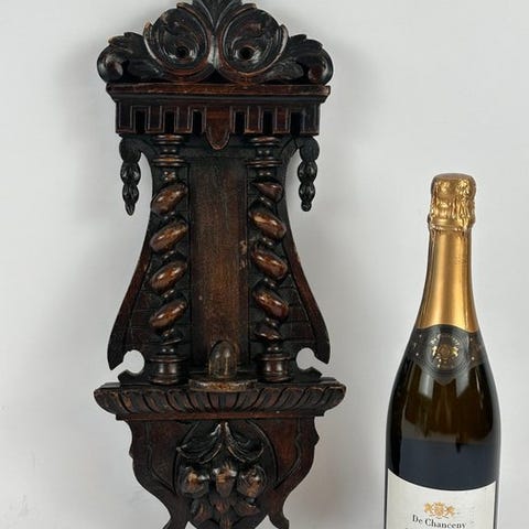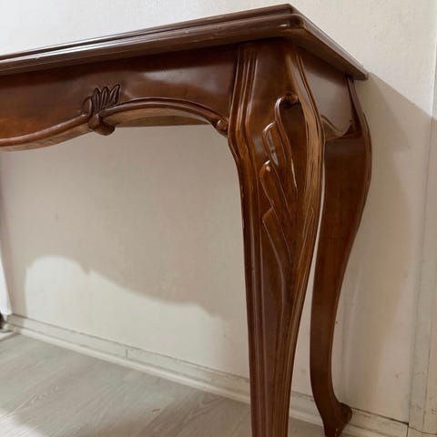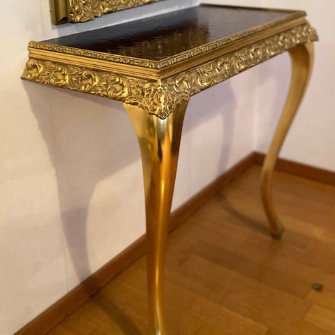 Häikäisevän kaunis, erittäin koristeellinen ja erittäin tyylikäs kultauksella varustettu puinen konsolipöytä. Esine on kauniisti suunniteltu ja valmistettu suurella huolella. Konsolipöytä on runsaslyöty monimutkaisilla kukkakuvioilla. Koemme esineen olevan kokonaisuudessaan hyvässä alkuperäisessä kunnossa, ja sillä on upea, alkuperäinen patina.Mitat: korkeus 10 cm, leveys 41 cm, syvyys 15 cmTuote lähetetään rekisteröidyllä lähetyksellä.