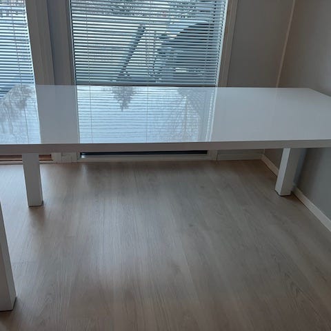Valkoinen pöytä, valmistettu puusta ja päällä valkoinen maali. Tukevat paksut jalat ja runko. Yksinkertainen ja moderni muotoilu, sopii hyvin erilaisiin sisustustyyleihin. Maalipinnoilla käytön kulumaa, keskellä kääntyvä luukkuPöydän tyyli on moderni ja se on peräisin nykyaikaisesta skandinaavisesta muotoilusta, joka korostaa selkeitä linjoja ja käytännöllisyyttä.