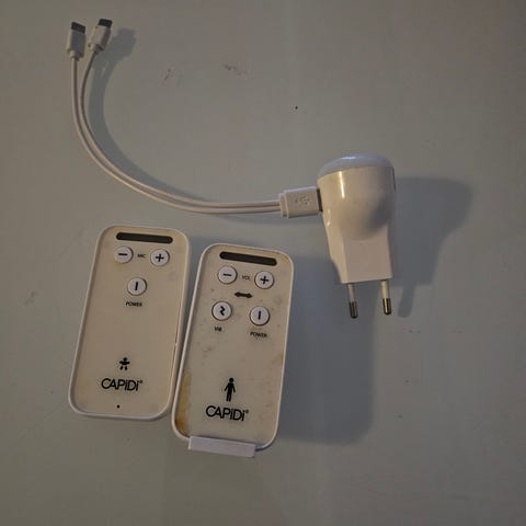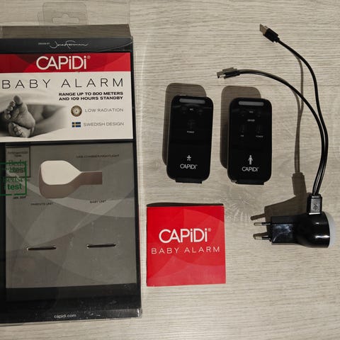 Pieni ja näppärä Capidi itkuhälytin. Helppo käyttää. Molemmat yksiköt langattomia. Akut hyvässä kunnossa ja toimii hyvin. Laturi mukana.