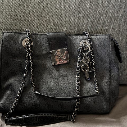 Guess naisten käsilaukku. Laukussa on hopeiset metalliosat ja ketjuhihna. Sisältää useita lokeroita ja vetoketjutaskun järjestelyä varten. Kohokuviointi, irroitettava olkahihna. Mukaan säilytys pussi.