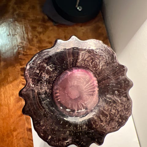 Kaunis ovaalin muotoinen lila vintage lasiastia.