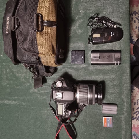 Mukaan saa lisäksi verkkovirta-adapterin, jolla onnistuu kuvaaminen ilman akkua. Mukaan myös kameralaukku ja tietenkin alkuperäinen akku ja laturi.