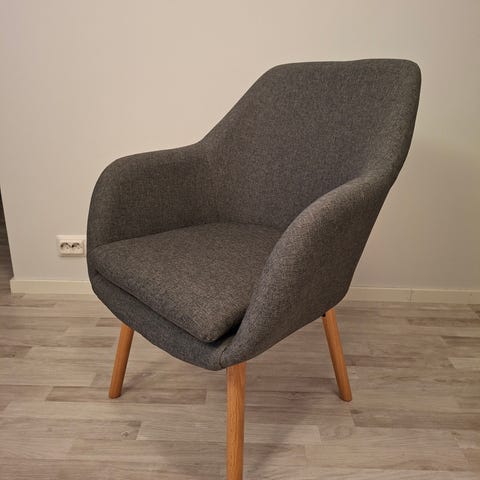 Myynnissä Jyskin Udsbjerg mallin rento ja ryhdikäs harmaa nojatuoli. Istuin- ja selkäpehmusteet vaahtomuovia. Jalat massiivitammea. L66 x K84 x S68 cm.