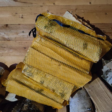 Suomalaista koivuklapia 80 litran säkissä 24/7. Säkki on yli kaksi kertaa suurempi kuin perinteinen 'huoltamosäkki'. Säkit on helppo siirtää varastoon ja myöhemmin tulisijan viereen. Säkin voi hävittää polttamalla.