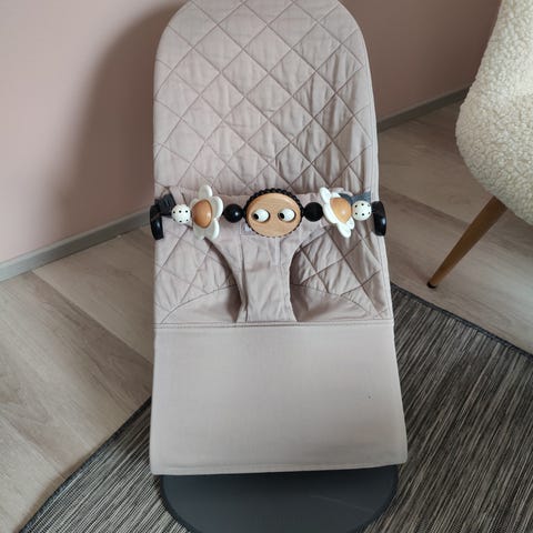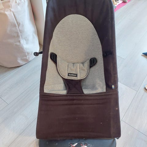 Harmaa Baby Björn sitteri. Kankaassa pieni reikä (ks kuva), joka on kyllä tarvittaessa korjattavissa. Ei vaikuta käyttöön.