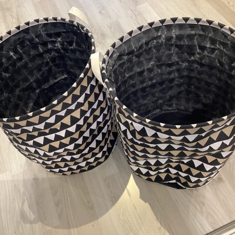 kankainen säilytyskori lehdille, jonka koko on 23 cm (korkeus) x 25 cm (pituus) x 29 cm (leveys). Sen kangas on yhdestä reunasta hieman kärsinyt. Hinta 3 euroa.