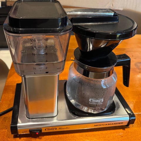 Moccamaster kahvinkeitin, ei aikakatkaisua, sen verran vanha malli, mutta kunnoltaan oikein hyvässä kunnossa ja ehjä ja toimiva.