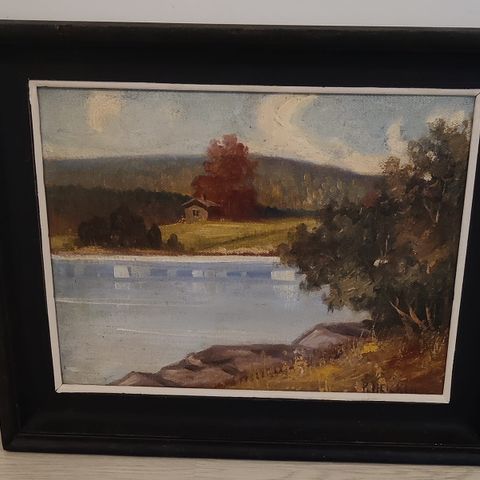 Kaunis rantamaisema kullansävyisissä puukehyksissä. Sortavalasta Oulun seudulle sodan aikana muuttaneen E.Janatuisen Rantamaisema vuodelta 1944, mitat 74x63cm