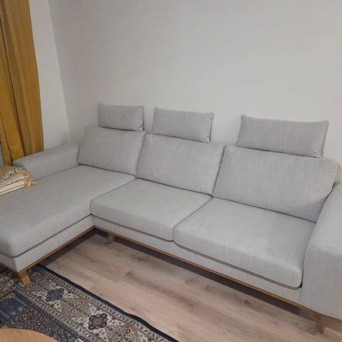 Copenhagen Nordic -avokulmasohva konjakinvärisellä bonded-nahalla. Ostettu noin 1,5 vuotta sitten. Melko vähäisesti istuttu, reissutöiden vuoksi kotona lähinnä käyty kääntymässä. OVH noin 2000 €.