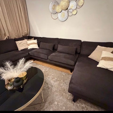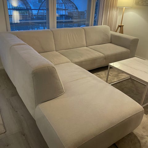 Copenhagen Nordic -avokulmasohva konjakinvärisellä bonded-nahalla. Ostettu noin 1,5 vuotta sitten. Melko vähäisesti istuttu. OVH noin 2000 €.