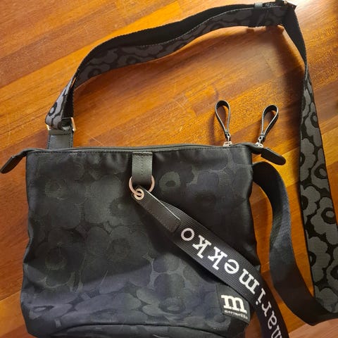 Marimekon käyttämätön, uusi Carry All olkalaukku. Laput kiinni. Laukku sulkeutuu vetoketjulla. Laukussa on säädettävä Unikko kuosinen olkahihna. Laukussa on 1 sisätasku sekä avoin ulkotasku. Etupuolelle on kiinnitetty Marimekko avaimenperä. Mitat leveys n. 23, korkeus n. 25, syvyys n. 15. Eläimetön/ savuton koti.