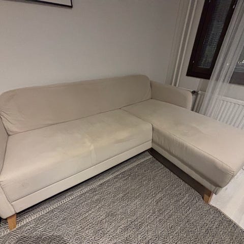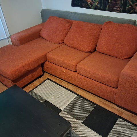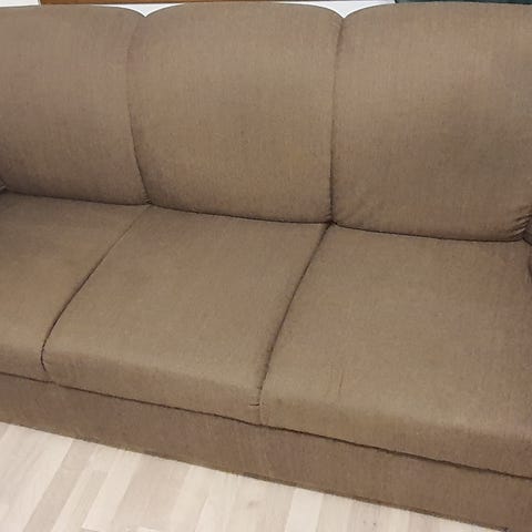 Annetaan divaanisohva. Kätisyys helposti vaihdettavissa irtonaisella divaaniosalla. Tyynyt saa helposti nostettua ja kankaan pois pesua varten. Selkänojan kankaat uusittu muutana vuosi sitten. Istuinosissa parista kohtaa kangas rikki (kuvissa).