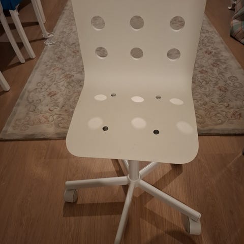 IKEA lasten tuoli, jossa on pyörillä varustettu metallinen jalusta. Tuolin istuinosa on muovia ja väriltään vaaleanpunainen. Soveltuu lapsille käytettäväksi esimerkiksi työpöydän ääressä.
