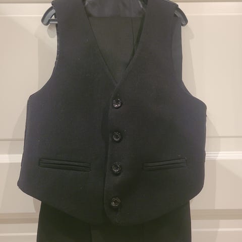 Myyntiin setti pojalle vaikka juhliin, tai ihan arjessa käytettäväksi. Koko 110cm. Liivin kokolapussa toinen koko, mutta vastaa mielestäni kokoa 110cm. Housuissa jonkin verran haalentumaa, jota kuva ehkä korostaa. Myös liivi on täysin musta, vaikka kuvassa haalistumaa.