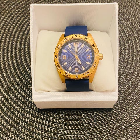 Guess miesten rannekello, jossa on neliönmuotoinen kellotaulu ja nahkaranneke. Rannekellossa on koristeellinen kellotaulu ja leveä nahkaranneke, joka on valmistettu nahasta. Ollut pitkään käyttämättä, pariston vaihto ostajalle.