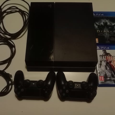 Sony Playstation 4 pelikonsoli, musta väri. Mukana kaksi ohjainta, joista toinen on kultainen ja toinen musta. Konsoli soveltuu Playstation 4 -peleihin ja gta 5 tulee mukaan