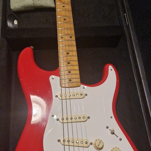 Perus 60's stratocasterista poiketen tässä siis 12" radius ja hiukan tymäkämmät nauhat (vasta hiotut). Kaulan muoto mukavan pyöreä C. Bodyssä jotain ihan pientä dingiä, mutta ikäisekseen kunto erinomainen. Kampi kadonnut ajan saatossa.