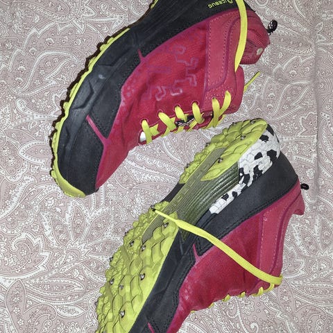 Hyväkuntoiset nastalenkkarit, koko 40,5. Leveä lesti, vastaavat mielestäni numeroa pienempää kokoa. Vasemman kengän kantapäässä kangas hieman revennyt (tästä kuva). Koiratalous.