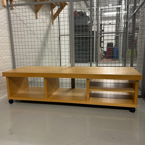 Puinen TV-taso hyllyllä ja laatikoilla