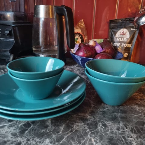 Kaunis, limenvärinen (kellertävä vihreä) astiasto yhteishintaan.