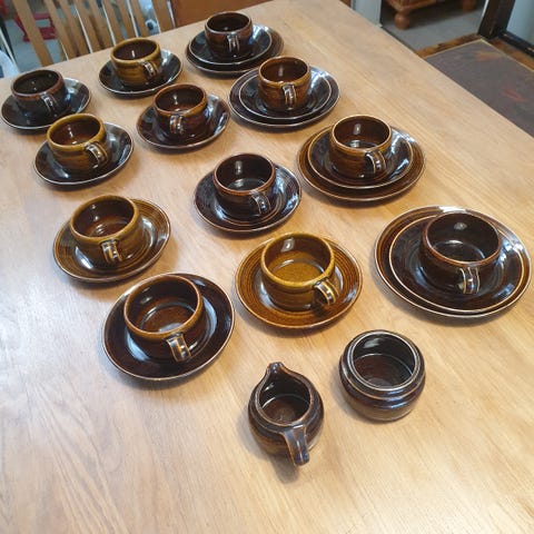 Myynnissä kuvassa oleva Arabian Mahonki-astiaston teekuppi ja aluslautanen, jonka on suunnitellut Ulla Procopé. Sarja on ollut tuotannossa vuosina 1961-1974.