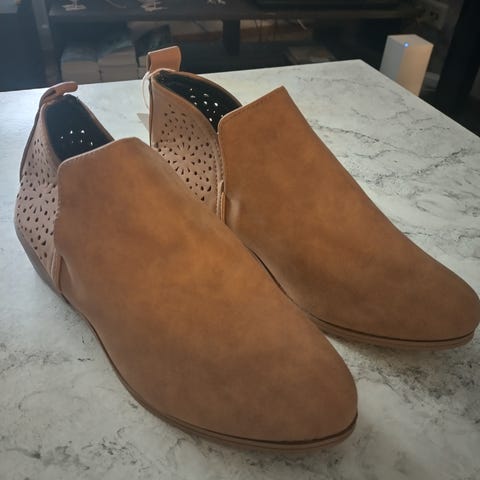 Sisäpohja aitoa nahkaa. Kiilakorko n. 7,5 cm. Käytetty yhden kerran.