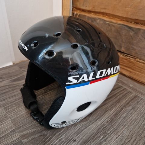 Salomon Kid S-koon lasten laskettelukypärä. Etureunasta pinnoite hieman irronnut. Kulkeutuu hml-tre välillä