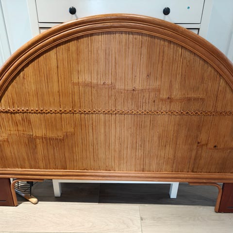 Puukehikkoinen hyväkuntoinen sängynpääty, jossa rottinkinen somiste.