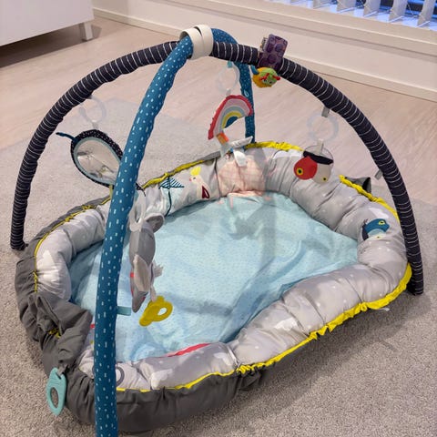 Myydään vauvan värikäs leikkialusta / puuhamatto / leikkikaari. Kaarissa roikkuvat hahmot saa vinkaisemaan puristamalla.