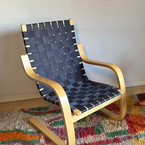 Artek Alvar Aalto nojatuoli, jossa pellava/vaaleanvärinen kangasistuin ja koivurunkoinen kehys. Tuoli on erinomaisessa kunnossa - kangasverhoilu ja kaarevat koivurunkoiset käsinojat uusittu ja kunnostettu RetroAalto yrityksen toimesta. Tuoli ollut vähäisessä käytössä yläkerrassa vauvanhuoneessa. Tuolloin täältä saatu hinta-arvioksi ~700€.