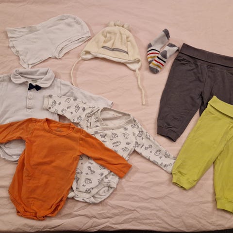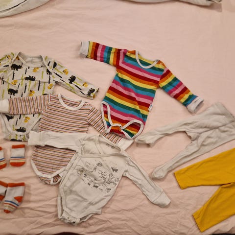 Myydään paketti äitiyspakkauksen 2020 vauvan vaatteita. Savuton koti, ei lemmikkejä, pesty vain hajusteettomalla pesuaineella.