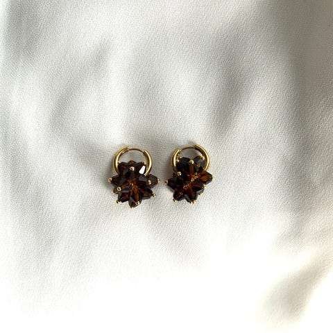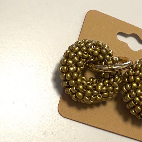 Valkoiset / kultaiset pienet ja kevyet kaiko-tyyliset lasihelmikorvakorut, kulta / hopea rengas. Korurasiassa. Donitsin ulkohalkaisija noin 2cm.