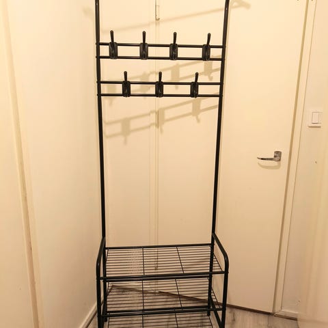 Hyväkuntoinen naulakkopenkki, 4 kenkäkaukaloa ja kenkäteline.