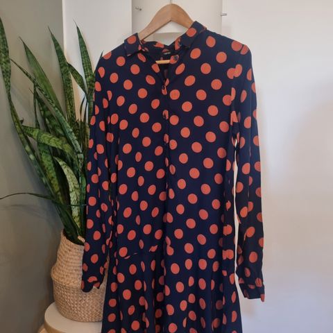 Nanson priimakuntoinen, A-linjainen Pom Pom mekko 100 % viskoosia. Kuosissa tummansinisellä pohjalla oransseja palloja. Taskut, O-pääntie, muotolaskokset, niskassa nappi. Pesty tuoksuttomalla ja allergisoimattomalla pesuaineella ja silitetty. Ei eläintalous. Koko 36: kai-kai 48 cm, olka-helma 94-96 cm (takaa hiukan pidempi). Hihan pituus olkasaumasta 47 cm.