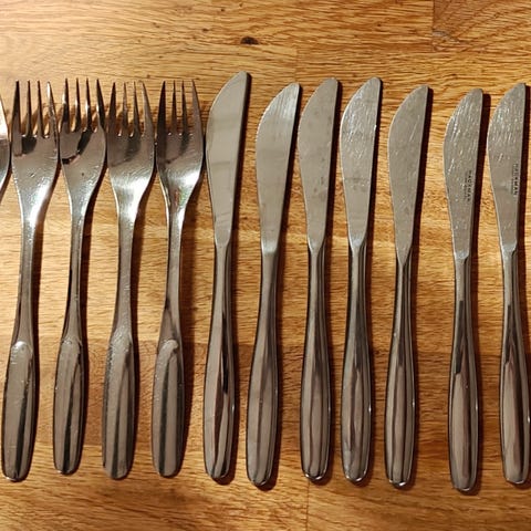 Saatavilla koko setti: haarukat, veitset, ruokalusikat ja teelusikat. Iso määrä.