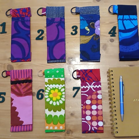Retrokankaista ommeltu pussukka kalenterin kanteen. Sopii hyvin n. 21,5 cm korkeaan kalenteriin. Penaali on tuettu tukikankain. Toridiili tai normaali kirjelähetys.
