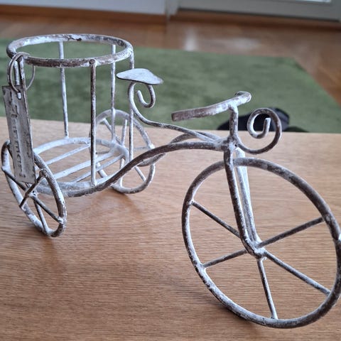 Metalli polkupyörä, puolikas, seinälle, pyörässä kori.( Minulla kukkia)