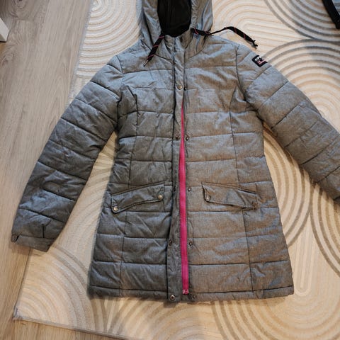 Siistikuntoinen, villakangastyyppinen vettä hylkivä kangas, irtohuppu, lumieste vyötäröllä, taskuissa vetoketjut